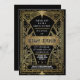 Vintage Gold Art Deco Bridal Shower Invitations -- features a printed gold gradient frame with glitzy accents through out. The colour scheme is gold and black with a touch of white (wording). This glam design also features a monogram styled near the bottom in a 20's design with the groom's last name initial larger than the two beside it. The left monogram is for the bride and the right monogram is for the groom's first initial. Upgrade from basic card stock to something glitzy to bring out the glam in these art nouveau designed invites. You can do this to the above right. Each invitation comes with a white fitted envelope. Matching RSVP cards can be found below -- also see the full matching collection below.