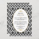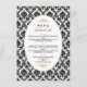The design features a vintage black and white damask background with a decorative gold border frame with an ornate floral flourish and is finished with elegant wording in black and gold.