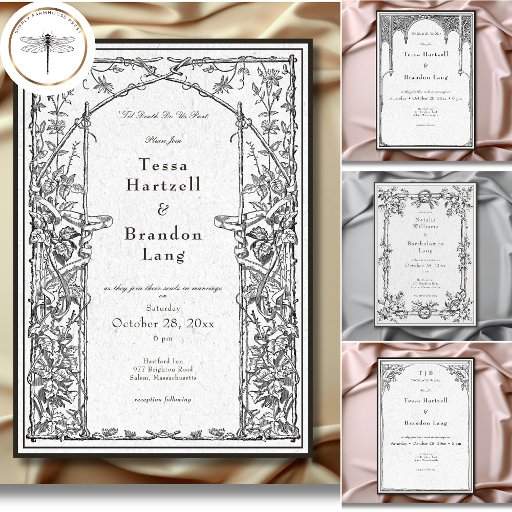 Elevate your gothic wedding with a medieval-inspired wedding invitation that exudes timeless elegance and mystery. Designed to replicate an antique vintage feel, this stunning design features delicate black line art medieval ivy vine border on a vintage, aged white background, evoking the charm of a bygone era. Edit the text for a handfasting ceremony as well. Let your love story unfold with an invitation as unforgettable as your day. Created by Simply Farmhouse Press.