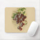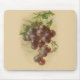 An illustration of a bunch of purple red grapes hanging on the vine with leaves, on a dark cream or beige background, from a vintage painting by artist Catharina or Catherine Klein, born 1861.