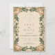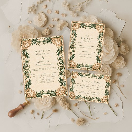 This timeless botanical design combines soft green foliage and ornate vintage scrollwork on a parchment-style background. The elegant greenery frame adds a refined yet natural feel, perfect for garden weddings, classic ceremonies, or nature-inspired events. Fully customizable for your special day.