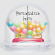 A vintage gumball machine snowman snow globe filled with bubblegum and ready to personalize on front and back. In a color of cheerful red. A nostalgic sweet treat.