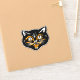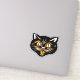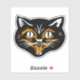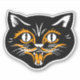 This vinyl sticker is a vintage Halloween black cat face with a smile showing its teeth with orange and white accents.