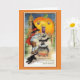A vintage Halloween card image features a little boy in a witch hat and cape standing over a bubbling cauldron and dropping bats into the brew. A black cat runs in fright. In the background is a large jack-o-lantern which serves as the boy's home. The verse on the front says, "This Halloween I'd like to brew a thrilling, chilling scare for you." Inside the card: "What am I going to be for Halloween? Drunk!"