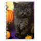 Notebook featuring a vintage Halloween kitten! A fluffy black kitty poses next to pumpkins against a purple background. A fun gift for Halloween parties and cat lovers!