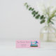 A stylish skinny business card, fully customisable, with a charming image of a vintage hand sewing machine in shades of blue on a pink background. Use it to promote your sewing or craft business.