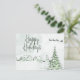 A vintage-inspired Happy Holidays postcard featuring a serene snowy landscape. The illustration showcases a delicate line drawing of snow-covered pine trees and cozy houses nestled in a winter wonderland. Above the scene, the silhouette of Santa Claus riding his sleigh, pulled by reindeer, glides gracefully across the sky. The card is adorned with a subtle aged texture, evoking a sense of nostalgia and holiday warmth. Perfect for sending seasonal greetings with a classic touch.