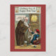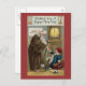 A classic vintage New Year card showing Father Time shaking hands with January Ist who is represented by a small child. A grandfather clock showing the time as midnight is in the background.