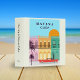 Modified vintage Havana Cuba travel poster for front of this travel scrapbook and/or photo album. The modern style, clean looking image has pink, orange and green buildings with a retro, red, car in front of the buildings. Silhouette palm trees on the left, with a blue sky and big orange sun in background. The binder background is a solid bone white colour. Templates provided on spine. Perfect for your vacation scrapbook memories and/or photos from a trip to Cuba.