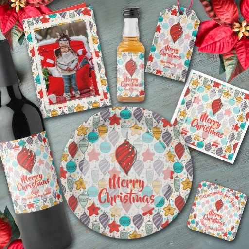 Vintage Christmas tree ornaments paper plates in 2 sizes - 7" and 9" compliment your holiday or Christmas party. Merry Christmas and your name in chic lettering personalizes this design. MATCHING items in our store.