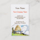 A custom business card with brown and orange retro script and block letters and a vintage etching of a happy straw beehive with buzzing bees against white clouds.