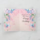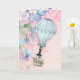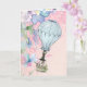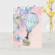 Birthday greetings with a vintage blue hot air balloon rising in a pink and blue floral background. The inside text is customizable.