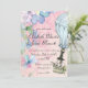 Sweet vintage-looking hot air balloon with a couple and an old-fashioned telescope illustration with a floral pink and blue-flowered background.