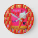 Features a vintage ice cream parlour sign in colours of pink, white and orange, featuring a soft serve ice cream cone. Set against a cone patterned background. A fun clock for your kitchen or anywhere that suits you. You can change the hand colours. Numbers are removable.