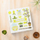 A recipe binder featuring a lemonade themed pattern with illustrations of a pitcher of lemonade, a mason jar of lemonade, lemon wedges, a lemon tree, a canister of sugar, a hand juicer, a sieve, and a wooden spoon. Personalize with your name.