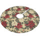 Tree skirt featuring a vintage inspired pattern of white and red poinsettia plants with green leaves on a tan background.