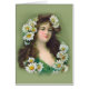 Pretty vintage woman has long brown hair and a daisy garland. Lovely Irish Colleen wearing green.