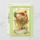 Antique St. Patrick's Day greeting card art featuring gold Irish harp, wreath with green ribbon, greeting, rustic background and scroll with verse in gold script.