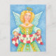 This Holiday post card features a delightful vintage image of a golden haired angel with bright blue eyes, a halo, wings, and a wearing a green and gold gown, and a gold star necklace. She is holding a red and white banner with the text JOY in green on it. The image is placed on a bright blue background. The back of the card has plenty of room for your custom message. Celebrate Christmas the old fashioned way! For hundreds of vintage and contemporary Christmas images on a variety of products, check out the "Christmas" section in our store.