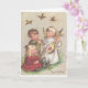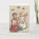 A vintage Christmas card image features a little angel girl singing and playing a lute. She has joined a young boy and girl to harmonize on the holiday song "Joy to the World." The boy plays a horn and the little girl sings along while birds flutter overhead enjoying the sweet sounds. The message inside the card is, " Peace and love to warm your heart this holiday season."