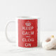 Everybody knows the slogan from the WWII poster: Keep Calm and Carry On. It's redone here for clog dancers and says, "Keep Calm and Clog On." The poster is also made to look vintage / retro through the use of distressed text and a worn, tattered, antique red background. This is a trendy mug design for the clogger / clogging fan.