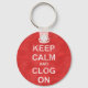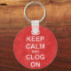 Everybody knows the slogan from the WWII poster: Keep Calm and Carry On. It's redone here for clog dancers and says, "Keep Calm and Clog On." The poster is also made to look vintage / retro through the use of distressed text and a worn, antique red background. This is a trendy keychain for the clogger / clogging fan.