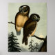 VIntage painting of Kirtland's Owl features two quizzical owls perched on a pine tree. Illustrated in the Victorian Era, 1862 by artist and American ornithologist John Cassin.
