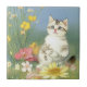 Ceramic Tile featuring an adorable kitten illustration. A white kitten with black stripes and big eyes sits on its back legs in a garden of pink, yellow, and white flowers. A wonderful gift for cat lovers and Victorian art enthusiasts!
