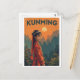 Discover the charm of Kunming, China, with this beautifully illustrated vintage travel poster style postcard. It features a young person in traditional Chinese attire, adorned with intricate patterns and delicate headwear, gazing thoughtfully over a landscape of majestic mountains under a warm, golden sunset. The foreground is dotted with lush foliage and subtle flowers, evoking the "City of Eternal Spring." Perfect for sending a unique greeting, decorating with Asian-inspired art, or collecting retro travel memorabilia. This postcard captures the cultural richness and scenic beauty of Kunming.
