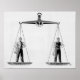Vintage illustration black and white business symbolism design featuring two men balancing on giant scales of justice.