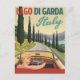 Take a ride through the Italian countryside with this vintage-style postcard. The artwork features a classic red convertible driving along a scenic road with majestic cypress trees and a beautiful view of Lake Garda (Lago di Garda). This stylized design evokes a sense of adventure and romantic road trips, making it a perfect souvenir for travel lovers, car enthusiasts, or anyone who appreciates the charm of retro art.