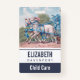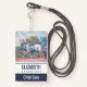 Personalized name badge with a vintage image of 2 gentle lambs pulling a cart (unseen) and decorated with pretty blue ribbons.