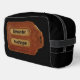 Personalize this photographic toiletry bag's vintage faux leather identification tag with His Name and occupation or spirit. Ideal gift for Retirement, promotion, birthdays or Father's Day, whether for a Roadtripper, Wanderer, Retiree, World Traveller or Best Dad, Man or Groomsmen. It's has a classic look in black and its realistic looking photographic rich weathered brown lather and old aged tan paper inserts. All text on each side is individually customizable for the perfect personalized gift.