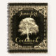 An antique leather look personalized recipe book featuring a family tree design in gold. Art by Amelia Carrie