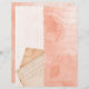 Pretty apricot coloured scrapbook paper in a collage style with vintage text, faded apricot pink watercolour and an old postcard, with pale apricot pink and white stripes.