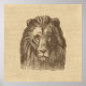 Square poster for big cat lovers features vintage brown tinted lion head illustration on light tan "burlap" background.