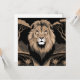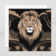Vintage Lion Portrait, this design features a vintage illustration of a portrait of a lion with a calm and superior appearance. The background is a black and white safari landscape with trees and mountains. The overall image has an art deco style.