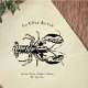 A refined black-and-white lobster illustration designed for elevated coastal branding and paper goods. This rubber stamp features a classic lobster sketch paired with understated, European-inspired typography, making it ideal for packaging, stationery, menus, recipe cards, and small business branding with a coastal or culinary focus.