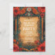 The invitation features a classic yellow vintage background in the centre, offering a warm and nostalgic touch. This vintage backdrop is elegantly framed by a border of rich red flowers, adding a vibrant and festive edge to the design. At the top of the invitation, a beautifully detailed sugar skull graces the design, adorned with intricate patterns and a touch of traditional elegance.