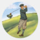 Vintage looking golfer in early 20th century attire taking a swing of his golf club on a watercolour landcaspe . Ideal gift for the golf fanatic or golfer in your life. sgb01