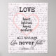 Vintage Love Bible Verse Posters and Prints. Black and white canvas print with beautiful antique handwriting background, featuring the bible verse about love from Corinthians. Love bears, believes, hopes, endures all things. Love Never Fail. See more at our store, Christian Quotes. Link below: