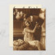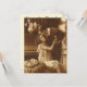 Vintage sepia postcard (ephemera) featuring a love and romance image with a couple in love snuggling together next to a piano.