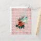 Beautiful digital art collage features "glowing" teal and ivory luna moth with vintage floral bouquet on distressed pink harlequin pattern background