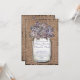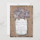 Vintage Mason Jar with Flower Bouquet on Rustic Burlap Print Wedding Invitations. This distressed antique design has a faded worn out look with a vintage canning jar filled with flowers. The back has the same mason jar on burlap design with the word "Love" at a diagonal. The writing is a lilac lavender purple colour, but can be changed to any other colour using the Customize It button.