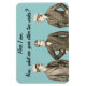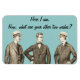 This magnet features a vintage image of three men, with the text, "Here I am. Now, what are your other two wishes?" The text, and background colour, can be customized as needed.