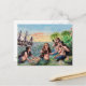 This beautiful postcard features four mermaids on the shore. In the background is an old fashion ship in the sea.