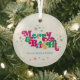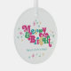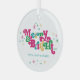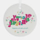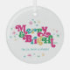 These 3" x 3" holiday glass ornaments feature a retro bright and colourful greeting, "Merry & Bright," in magenta, green, blue and gold with placeholders for your family name(s) and year.