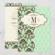 This modern take on a vintage inspired mint green, brown, and ivory floral damask wedding invitation has an ornate flourish scrolled pattern in brown, sitting atop a similarly intricate pattern of flowers and scrolls in shades of mint green. The decorative ivory label has more scroll-work ornaments, along with template text for you to add your own monograms. It would be ideal for an elegant spring, summer, fall, or winter wedding. The template text makes it suitable for many other special occasions too, such as an anniversary party, engagement party, or bridal shower. ****PLEASE note that everything will print as it appears on YOUR monitor. I will not see your order and Zazzle will NOT edit it for typos, alignment, sizing etc., so if you require formating or customizing assistance, please email me BEFORE you place your order. If you need any additional matching items, please email your request to niteowlstudio@gmail.com.