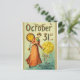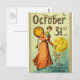 A victorian lady stands with a funky full moon headed man, a clock set to midnight, bats, and the words "October 31st" and "With All Hallowe'en Greetings".
