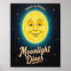 Great quality poster with vintage reproduction of 1940's Moonlight Diner Open 24 Hours road sign. Design includes big yellow smiling moon with small twinkling stars on black background.